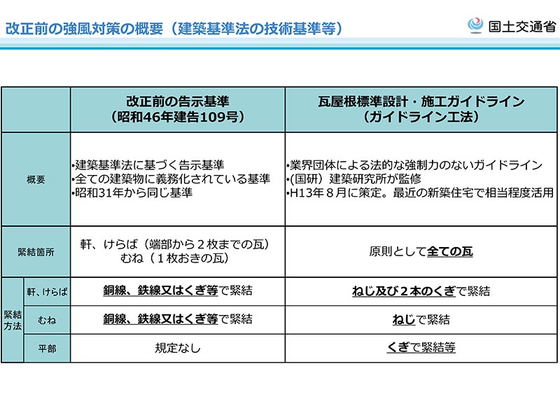 一方で、ムネに関しては、1枚おきの瓦を緊結すればよいこととなっており、緊結が義務となっている部分は50%に過ぎない。さらに、平部に関しては緊結の定めはないこととなっていた。改正前の告示では平部と半分のムネの固定化は不要とされていたことから、房総半島台風では平部とムネに脱落の被害が集中的に生じてしまった結果となった。