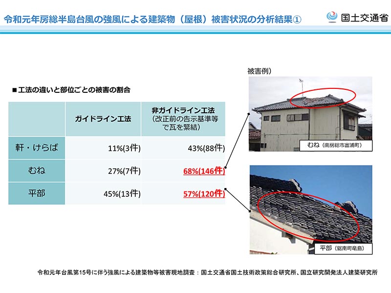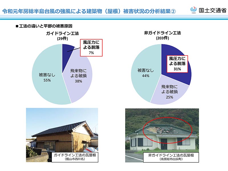 前出の国土交通省の資料によると房総半島台風では、ガイドライン工法による建物で生じた瓦脱落被害は23件となっており、非ガイドライン工法(改正前の告示に基づいた工法)の354件と比べると圧倒的に少ない。ガイドライン工法は地震のみならず、はからずも房総半島台風によって強風に対しても有効であることが実証されたといえる。