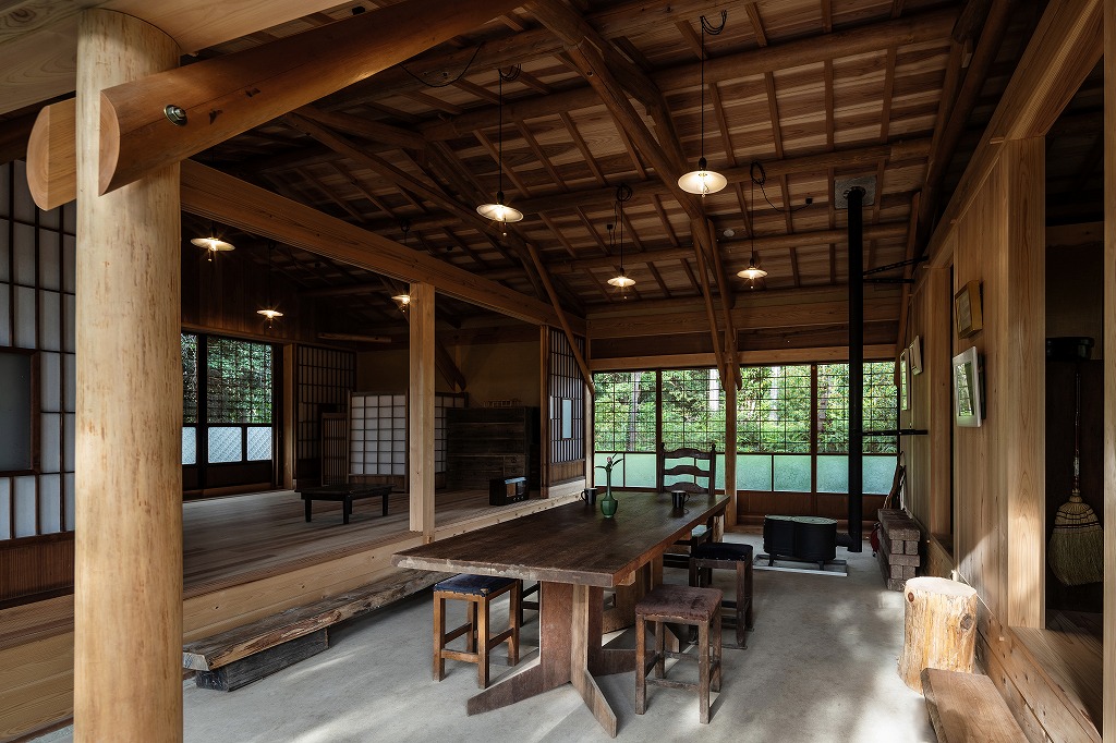 この古民家は改修後の2018年3月、「旧猪子家住宅」として国の有形文化財として登録されるほど見事な仕上がりに。竹内さんは旧猪子家住宅を利活用し後世に伝えるためにも、管理者である自分たちが作業し寝泊りできる建物を新たに建てることを決めた。それが「いかだ丸太の家」だ。
