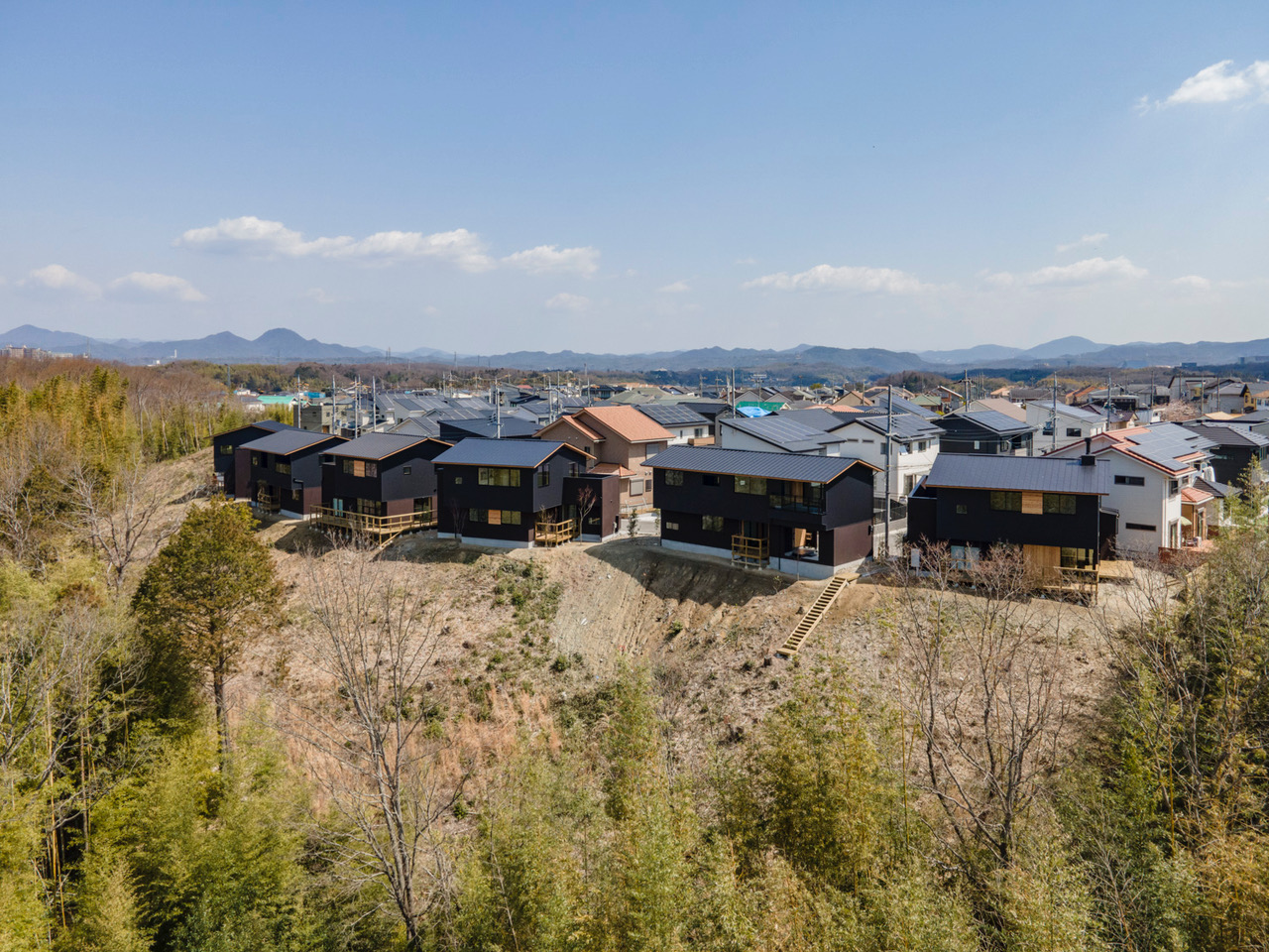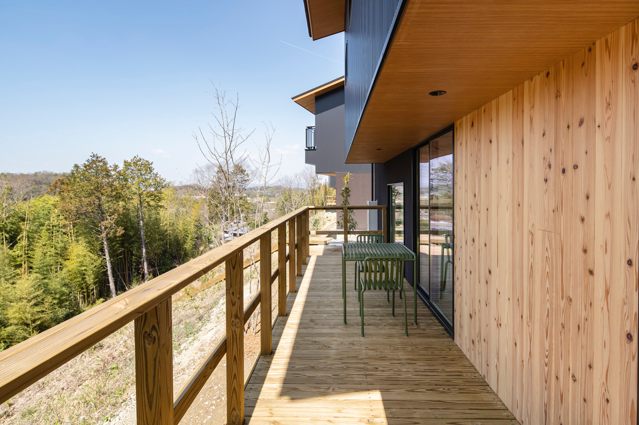 この景観を逆に生かしてはどうか?というアイデアから、テラスを設け自然と触れ合い、住居内から北側に広がる里山的な風景が楽しめるようにした。別荘とはいかないまでも、都心と離れた立地条件を加味した。大人の購入者層を意識して、設計は渋めのデザインに仕上げている。