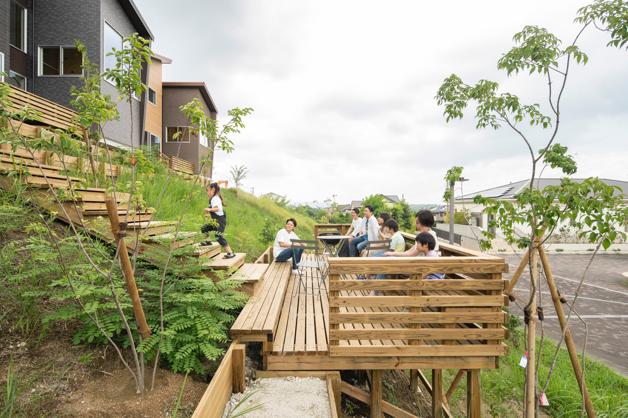 京都府南部・木津川市のニュータウン内の分譲住宅である、「ヨッシーワンズガーデン木津梅美台・リンクプロムナード」。敷地の半分弱が、30度の斜面地という課題がある土地だ。敷地境界線はそのままで、仕切り方を変えることで変化をつけた。居住者が共同利用できる菜園やデッキテラスなどを用意し、高低差のある住民交流の場を設けた。外構空間で使い道のない土地を、横につなげることでデメリットをメリットに変えている。
