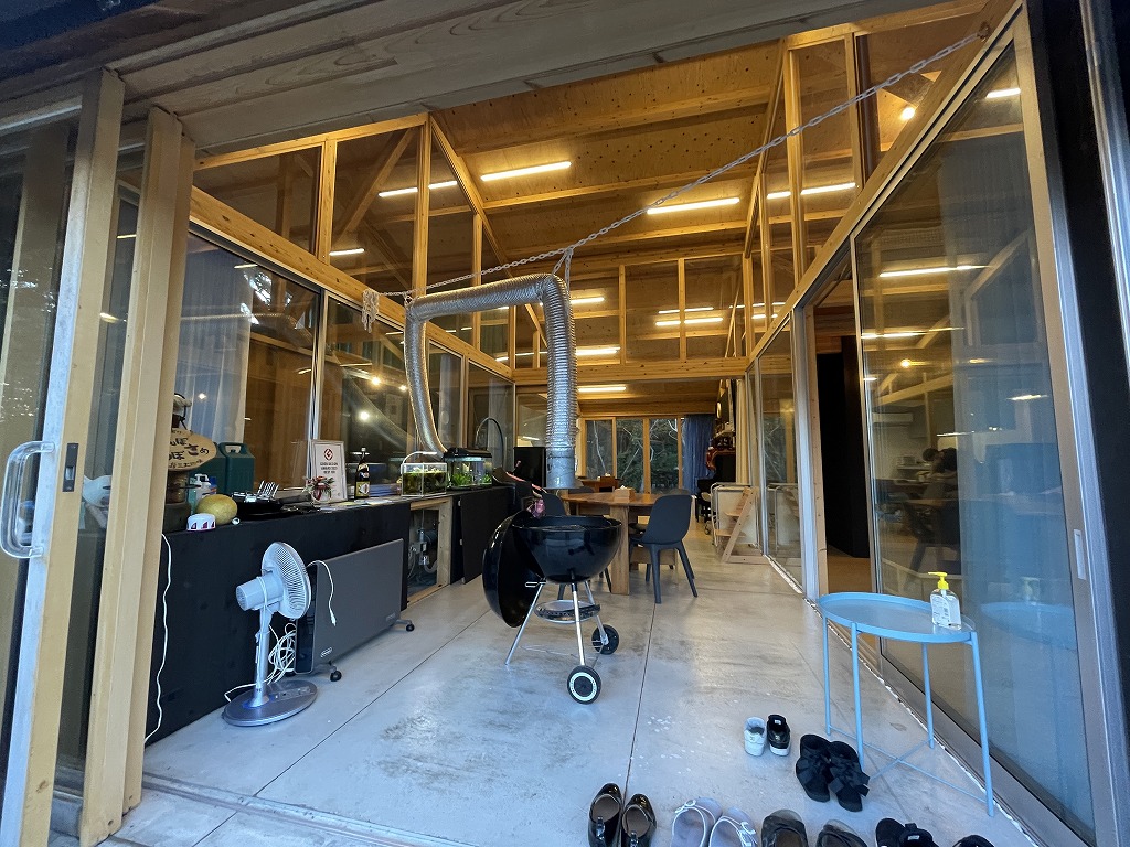 志摩の家で言えば、室内に換気システムを取り付ける必要があったが、この機械の目隠しをわざとホール側に出し、何かを置くのにちょうどいい高さや奥行きにしておいた。バーベキューをする時に材料を乗せてもいい。使い方は使う人次第で無限に広がるのだ。