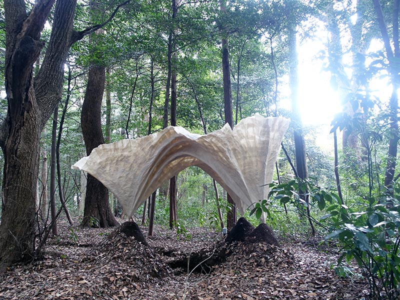 楮100%の和紙、生麩糊など、使用材料はすべて自然素材。天に向けて広がるフォリーは、ひとたび雨が降れば水を集め、水を含んだ和紙はやがて土に還っていく。一定期間だけ存在しうる儚さは、「建築とはこうあるべき」との概念を覆してくれる。「華奢な素材である和紙を構造として採用した着眼点がよかった。明治神宮の木々、土を利用し、逆さにして自立させた様は見事だった」との講評が聞かれた。