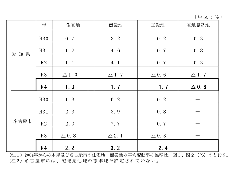 愛知県 地価公示結果の概要 用途別平均変動率