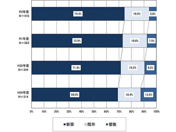 新築、既存(中古)、借換の使途別割合では、新築が圧倒的に多く前年比1.5ポイント増の74.4%となっている。最近は、中古住宅を新築のような内外装に生まれ変えさせるリノベーションが流行っているが、まだまだ新築信仰は根強いようだ。ただし、既存の割合も年々上がっており、3年前(2017年)から1.5ポイント増加している(18.4%→19.9%)。これは借換の割合が減っているということだ。具体的には2017年度では12.6%だったが2020年度には5.8%と半減している。その理由は明記されていないが、すでに低金利でローンを組んだ人が多く、借換をするメリットが薄いということかもしれない。