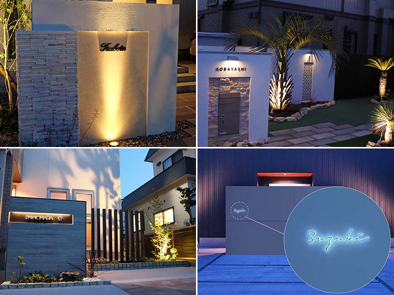 他に、へこみを設けた門塀にライン状の照明を仕込んで表札を上品に照らしたり、文字自体が発光するスタイリッシュな表札を設置したり、ライトで照らすことを前提とした門塀や表札も人気。
