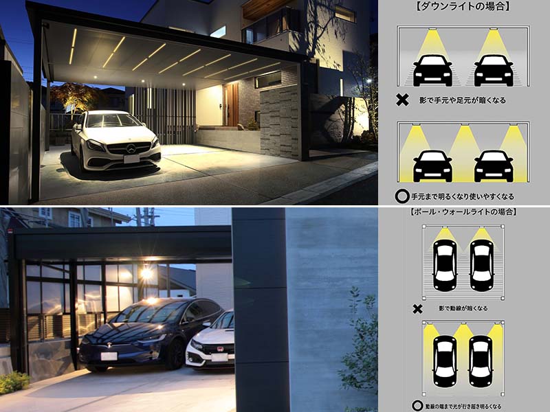 同時に、駐車場ではドアの開閉や荷物の取り出しなど、作業の機会も多いことを忘れてはならない。必要な場所に必要な光を届けられる照明の設置場所を考えたい。失敗例を挙げると、ダウンライトを車の真上から照らしてしまう、ウォールライトを車の真後ろから照らしてしまうなどだ。これでは、車の影で手元や足元が暗くなったり、光が前方まで届なかったりして、ストレスを感じかねない状況となる。上から照らすにしても横から照らすにしても、人の動線となる車と車の間や、壁と車の間に光が届く場所に照明を設置するといい。