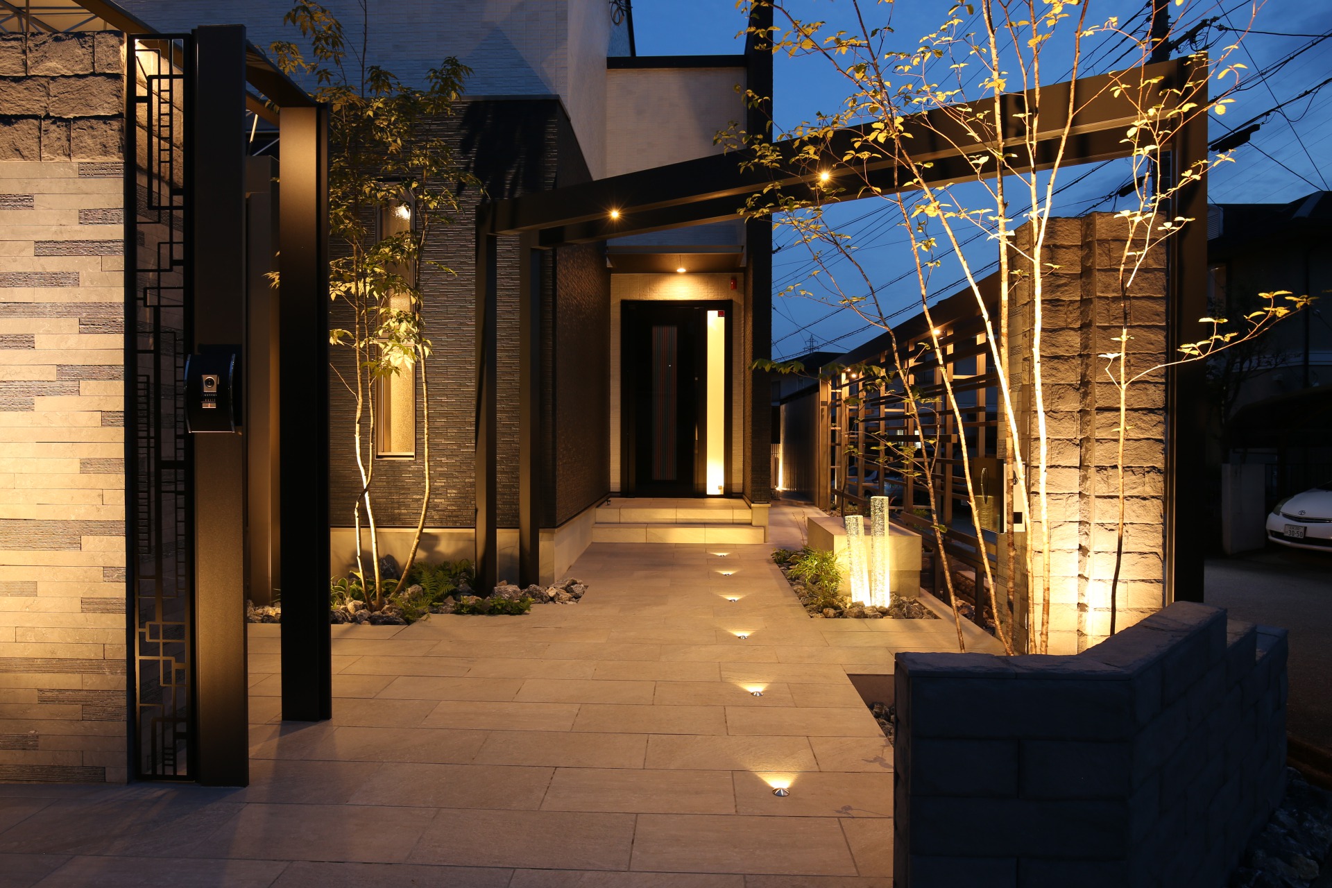 門を入ると、いよいよ家に向かって歩いていくことになる。ここでも、照明によって建物に向かう期待値を高める演出が可能だ。