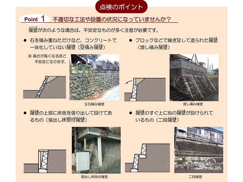 ぱっと見て分かりやすいのは増積み擁壁だろうか。マニュアルの写真ではブロックを積んだ擁壁が上に足されているが、ブロックは擁壁に使用すべき材ではなく、ブロックで擁壁が作られている時点で危険と思ったほうがよい。