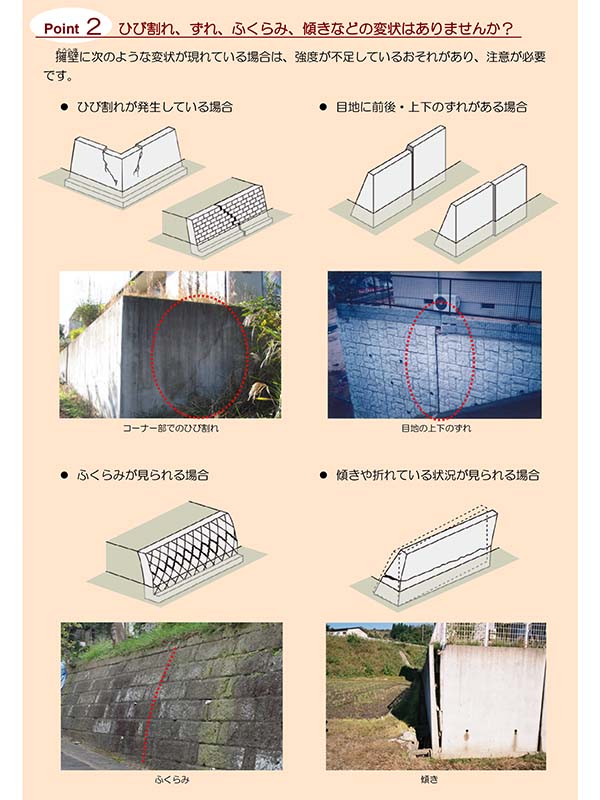 2つ目のチェックポイントは擁壁の変形だ。ひび割れ、ずれ、ふくらみ、傾きなどといったものがあれば要注意である。これについては作り方によってどこを見るべきかが微妙に違うので、マニュアルを参照しながらチェックしてみてほしい。
