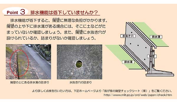 前出の国土交通省「わが家の宅地点検② ~擁壁編~」には古い擁壁の健全度を見るためにチェックすべき点が詳細に記載されている。そのうち、素人でも見て分かるだろうポイントが2点。まず、ひとつは湧水、排水など水に関する状況だ。