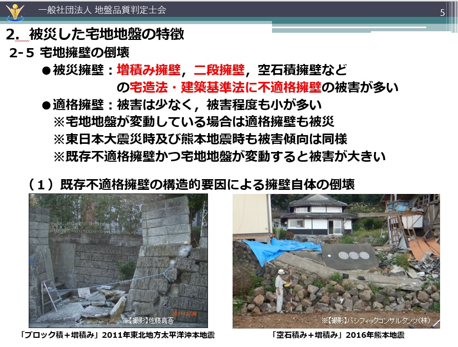 「増積み擁壁、二段擁壁、空石積擁壁など宅地造成等規制法、建築基準法に不適格な擁壁での被害が多く、適格擁壁では被害は少なく、被害程度もそれほど大きくないことが多いのです。ただし、揺れが非常に大きく、宅地地盤そのものが変動している場合には適格擁壁も被災しています」