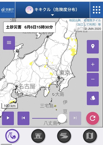 キキクルは、この指数と基準を利用して土砂災害、浸水害、洪水災害の危険度が高まっている状況を10分おきに予測し、地図上で1kmメッシュ・5段階(色)で表示するものだ。これを確認することで、自分が避難するべきかどうかを一目で把握することができる。