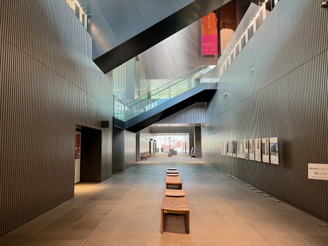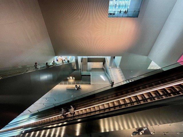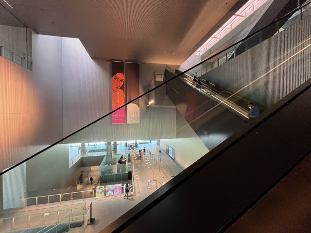 遠目には、黒く四角いシンプルな箱。しかし中に入ってみると、圧巻の大空間にあちこちから外光が差し込み、長大なエスカレーターと階段が縦横に交差する。2階はチケットカウンターやミュージアムショップがあり、誰もが無料で入れるスペースになっている。ベンチに腰掛けて展覧会の余韻を楽しむ人の姿も見られた。