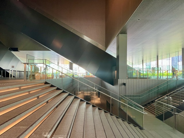 三方向を道路に接する大阪中之島美術館には「正面玄関」がない。南の国立国際美術館側と北の堂島川側にそれぞれ階段があり、道路から直接2階に上がることができる。北東側には向かいの「中之島四季の丘」との間を2階レベルで結ぶブリッジがあるほか、1階から入ってエレベーターで上がってもいい。さまざまな方向から入れて、さまざまな方向に抜けられるようになっているわけだ。
