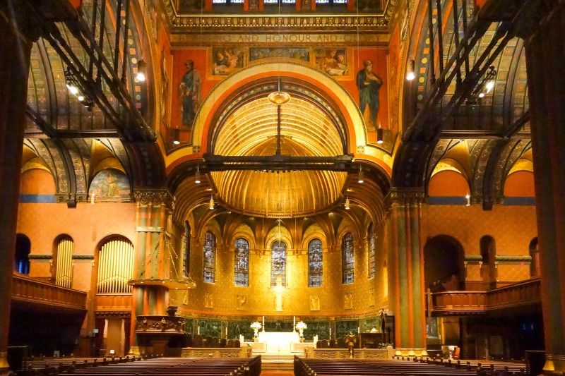 ステンドグラスや家具も多様な装飾で丁寧につくられており、ロマネスクの素朴さを超えた華やかさもある。その巨大さ、建築に費やされたであろう資金の莫大さは、当時ヨーロッパを追い越しつつあったアメリカの国力をうかがわせる。「伝統がないからこそ理想をつくりだせる、新しい国ならではの可能性を感じさせます。19世紀後半の時代にこれほどの意志と物量を教会建築に投じるという、ヨーロッパからするとほとんど時代錯誤のような現象が生み出した名作です。これもアメリカの面白さです」。