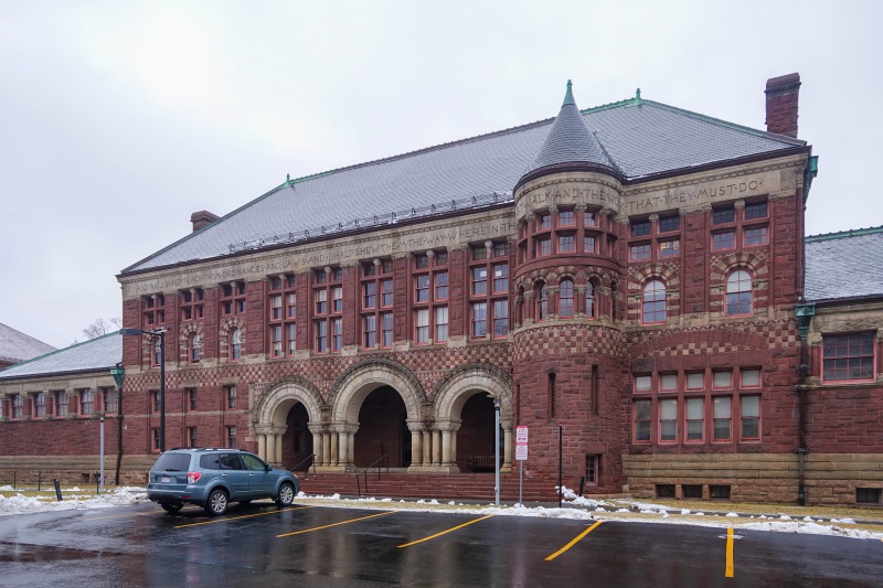 オースティン・ホール(1881年)は前出のリチャードソンの作品だ。「外壁は赤っぽい石材で覆われていて、まるで石そのものが内側から盛り上がって形づくられたかのような生命力を感じさせます。細部と全体、具象と抽象がリチャードソンならではの原理で統合されているのです」。