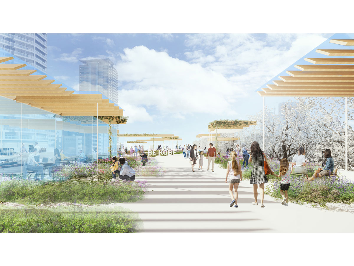 駅前広場に用意される2つのシンボル空間には、ハーブを中心に四季を通じて変化するさまざまな花や緑を植栽し、記念撮影スポットとして「BE KOBE」モニュメントの設置を予定している。「デッキ上ににぎわいを創出するために、ショップや専門店の誘致も目指しています。できれば、ハーブや植物に関連する業態だと親和性もありそうです」