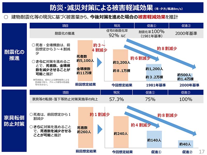また、住人が家具転倒防止策をすることも非常に軽減効果が大きい。被害想定では家具転倒防止策の実施率が57.3%を前提に死者は約240人と想定している。仮に家具転倒防止策の実施率が75%になると死者数は約140人、100%になると死者数は約40人まで減るとしている。