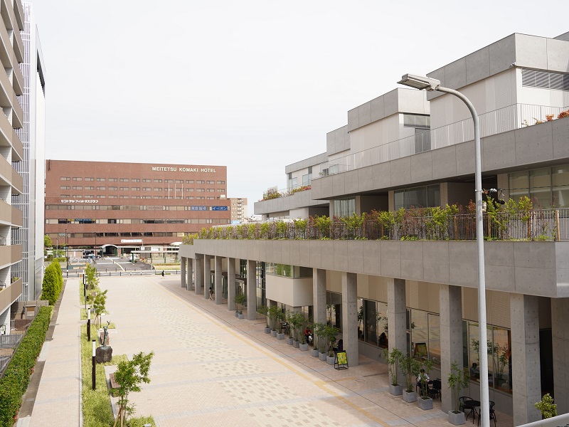 右が小牧市中央図書館で、奥が小牧駅。旧図書館は西へ約1kmのところにあり、駅前への移転でアクセスも便利に。また図書館北側(写真では左)の歩行者専用道路は、市の駅前整備事業により作られ、イベント活用もされる近年、図書館のイメージが変わりつつある。本を読んだり借りたり、あるいは学習の場であるだけでなく、人が集まる場所としてプラスアルファの機能を持つ図書館が全国で増えている。