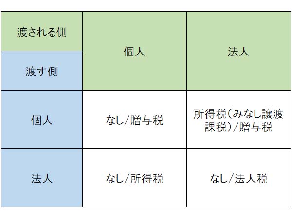 不動産物件の無償譲渡では、物件を渡す側と渡される側が法人、個人などの組み合わせパターンによって、かかる税金が変わる。