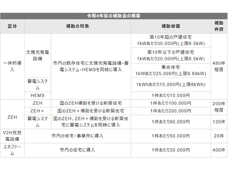 蓄電池の併設を条件に太陽光発電の補助金を拠出する自治体が増える中、太陽光発電設備単体の導入で補助金を利用できる自治体もある。例えば、仙台市では、市民は太陽光発電システムの導入に際し、1件あたり4万円の補助金を使うことができる。