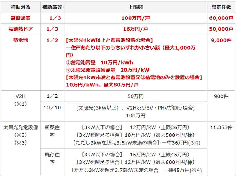 ※2 太陽光発電設備は、断熱改修又は蓄電池、V2Hもしくはヒートポンプ給湯器(エコキュート及びハイブリッド給湯器)のいずれかを設置した場合の上乗せ補助