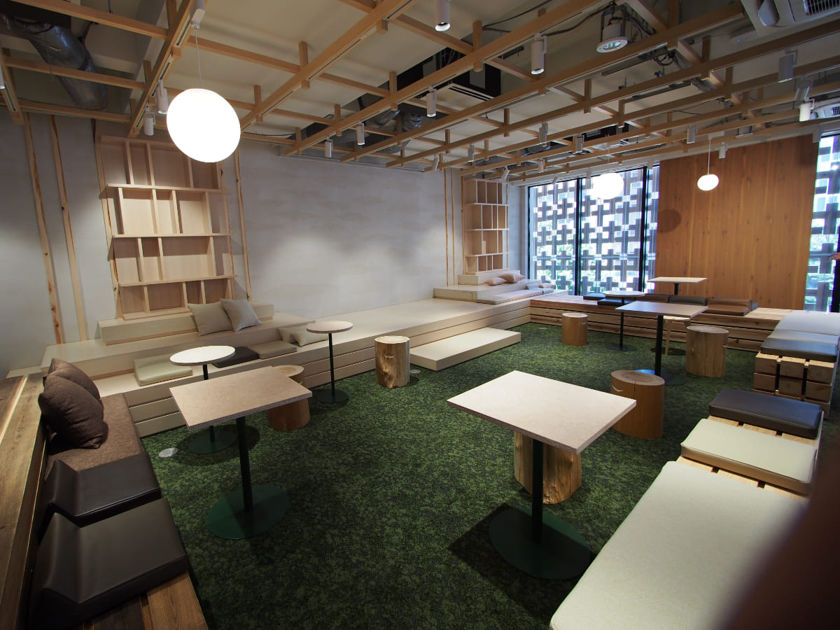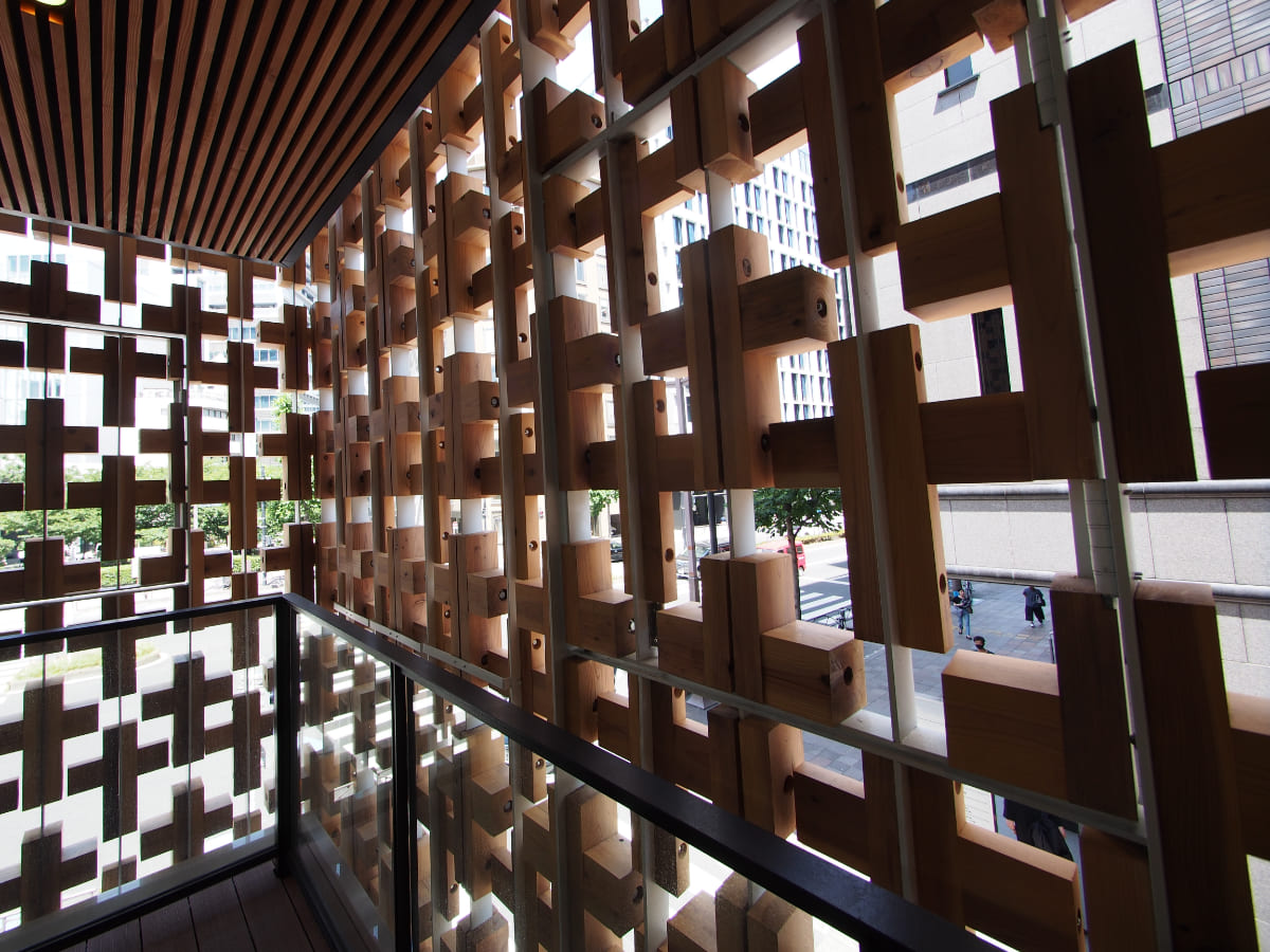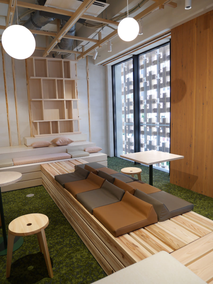 外観のデザインに目を奪われるが、多摩産のスギを使用した格子の隙間からは自然光が室内にやわらかく差し込み、利用者が快適に過ごせて生産性が向上するようにと機能面も考えられて造られている。