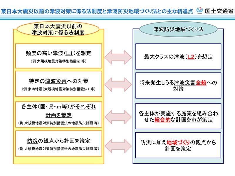 ただし、津波防災地域づくり法が制定される以前も、国は全く津波対策をしてこなかったわけではない。従前は、大規模地震対策特別措置法等の法律に基づき、「L1」と呼ばれるレベルの津波対策を実施していた。