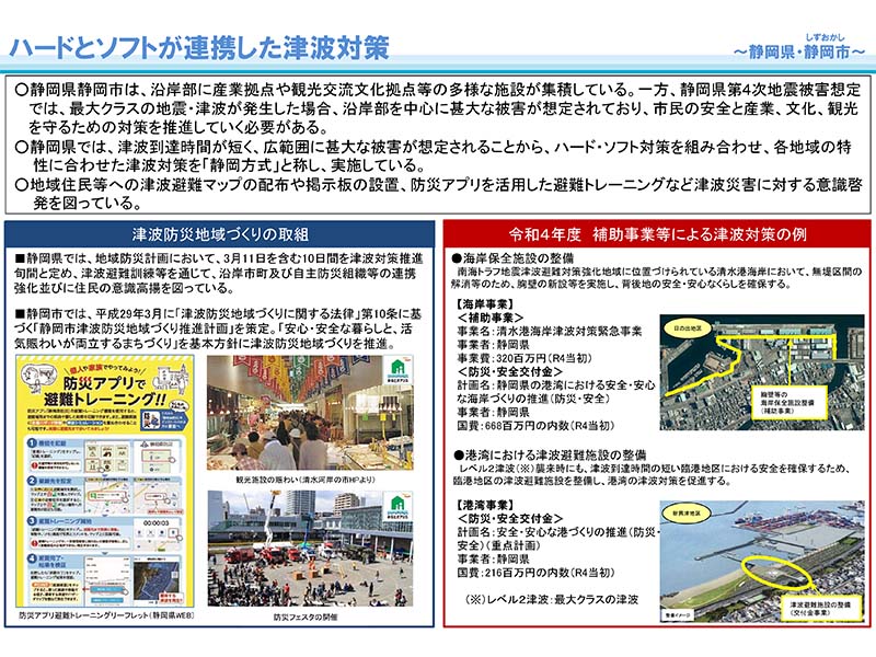 国土交通省では、2022年7月19日に令和4年度当初予算で実施される効果的な津波対策を紹介している。紹介されている事例は、「北海道浜中町」と「静岡県静岡市」、「愛知県田原市」、「高知県安芸市」、「静岡県牧之原市・吉田町」の5市町村である。上記のうち、ここでは静岡県静岡市の対策を紹介する。