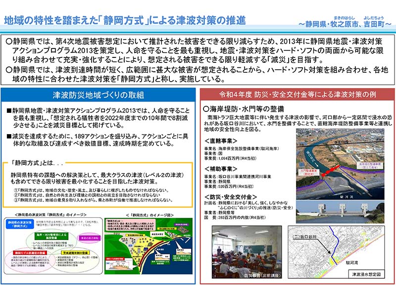 静岡市は沿岸部に産業拠点や観光交流文化拠点等の多様な施設が集積しており、また津波到達時間が短いことから、広範囲に甚大な被害が想定されている。静岡県では、津波被害を静岡県特有の課題と認識しており、「静岡方式」と称してハードとソフトの対策を早くから積極的に策定している。