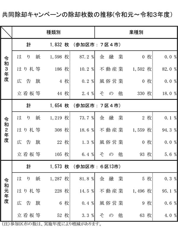 年度によって参加区市は異なるが、捨て看板は減るどころか逆に増加傾向にある。2021年度の種類別の内訳は、以下の通りである。