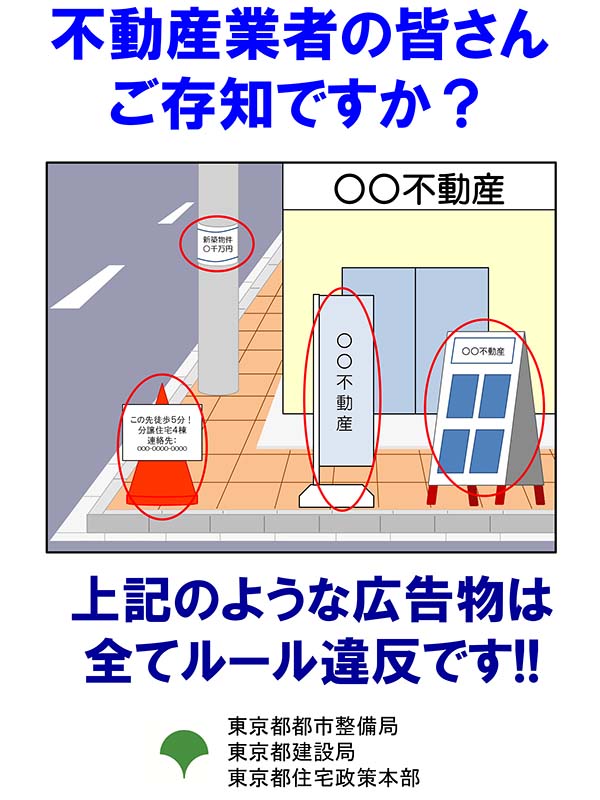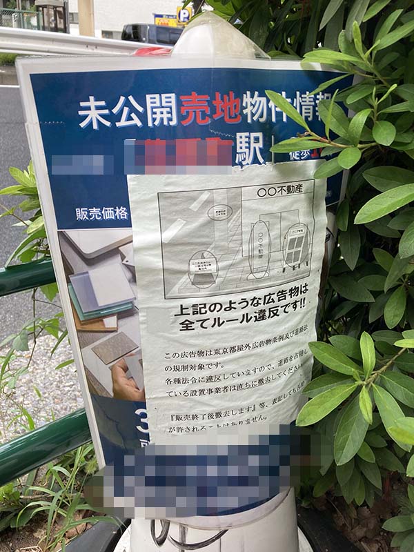 東京都では電柱や三角コーンなどへのはり紙、はり札、立看板、のぼり旗などの広告物を道路上に設置することを原則として禁止としているため、基本的に電柱等に不動産のチラシを貼ることは許可が下りないはずである。しかしながら、実際には電柱等にはり紙が貼られているため、そのほとんどは無許可で貼られているものと推測される。つまり、ほとんどの捨て看板は条例に反する違法な看板といえるのだ。
