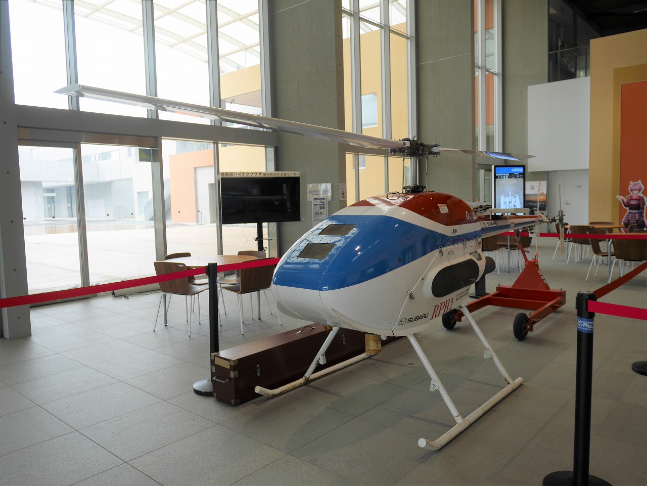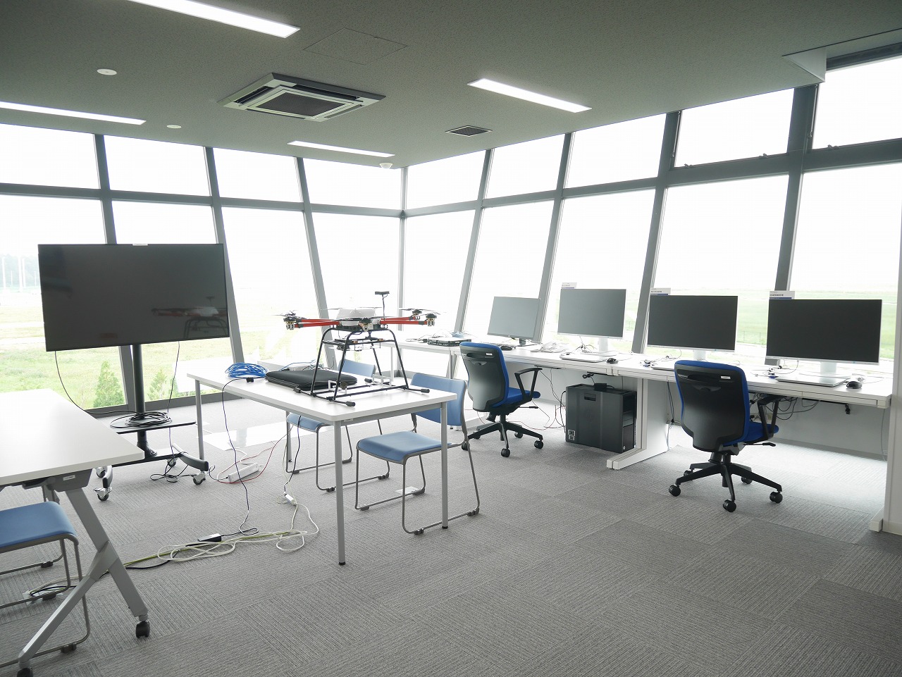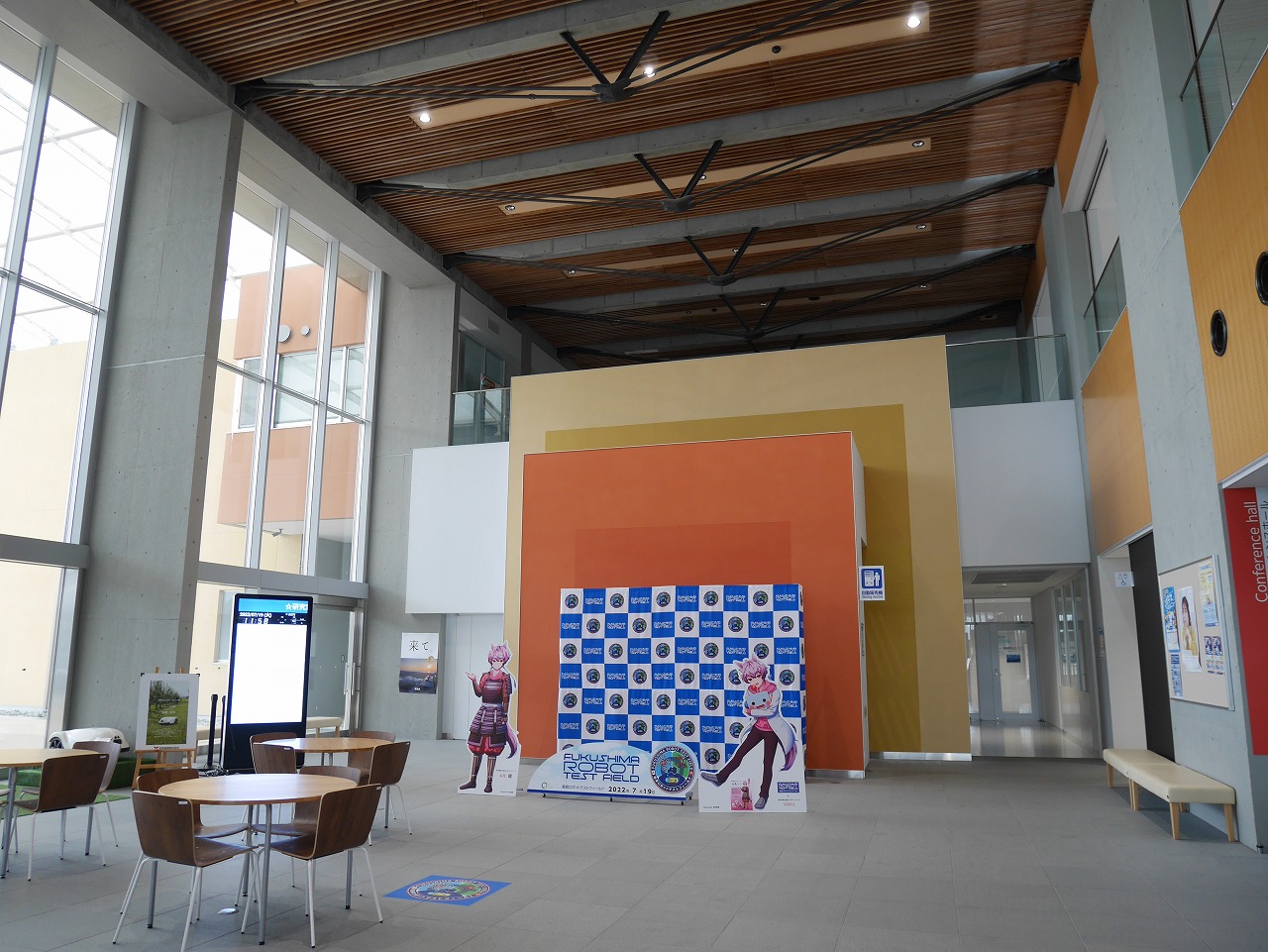 福島ロボットテストフィールドの敷地内中央にあるのが研究棟だ。ここには2022年7月現在、18の研究機関や企業が入居している。空飛ぶクルマを開発するテトラ・アビエーション株式会社、橋梁点検ドローンを開発する株式会社デンソーや、次世代モビリティを研究する東北大学などが入居する。
