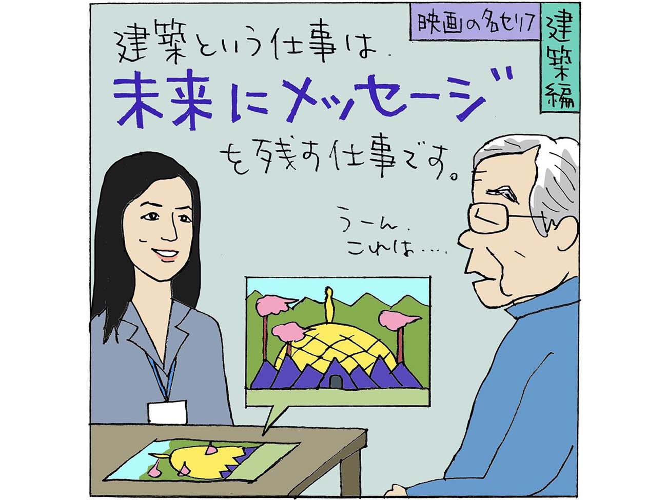 建築や住宅、それを設計する建築家は、映画やテレビドラマの中でどう描かれているのか。元・建築雑誌編集長で画文家の宮沢洋(BUNGA NET編集長)が、「名セリフ」のイラストとともに、共感や現実とのギャップをつづる。