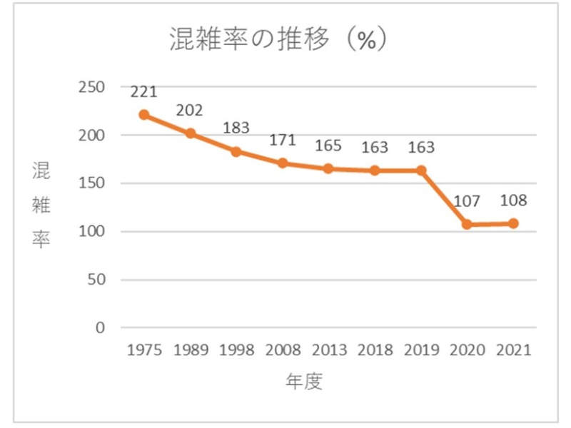 現在も区間によっては200%程度になることもあるが、過去には300%を超えることも珍しくなかった。しかしながら、前述のように「時差出勤の導入」「在宅勤務の導入」「フレックスタイム制の導入」「車両を長くする」といった対策で、混雑率は年々減少している。「都市鉄道の混雑率調査結果」(国土交通省)で東京圏(31区間)の平均混雑率を確認すると、1975年度では221%だったが1989年度には202%となり、2013年度には165%にまで減少。以降7年間横ばいだったが、2020年度からは110%を下回るまで激減した。これはコロナ禍によって時差出勤や在宅勤務が普及したことなどが影響しているようだ。