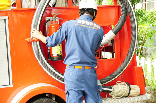 夏から秋にかけて日本は災害の季節だ。大雨や台風が毎年のように各地を襲い、川の氾濫や洪水などが起こっている。こうした自然災害のときや、火災現場などで活躍する一般の人たちがいる。消防署員に交じって、同じような服装で活動する、消防団員たちだ。
