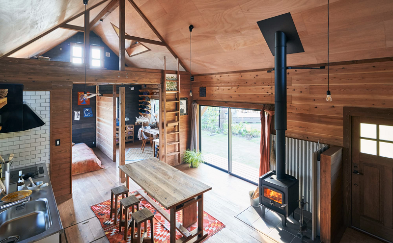 その言葉を裏付けるように、栖ログには家であれば当たり前にある「間取り」の概念はない。「居間」「洋室」といった部屋の用途を規定する言葉が使われていないのだ。室内を仕切る壁はなく、小屋裏空間も含めたひとつづきの空間となっている。さらに、建物と外部との境目もあいまいで、緩やかだ。地面と近い平屋ならではかもしれない。家庭菜園を日常の一部にしたり、ウッドデッキ・庭も含めて一つのリビングのように使うなど、建物を取り巻く環境すべてが暮らしの舞台となる。