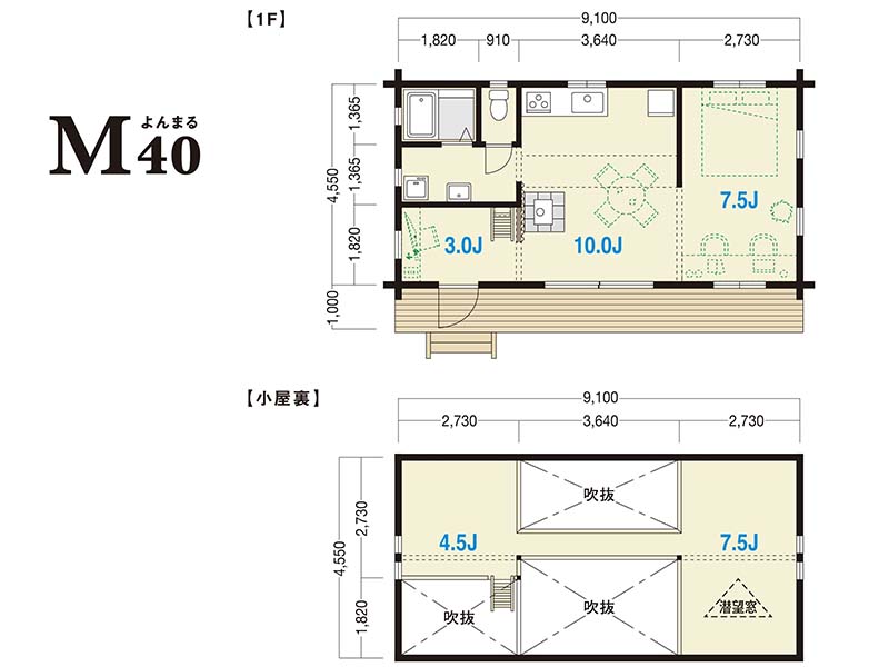 1階の床面積が41.40m2のミドルサイズ。コンパクトながら大人二人がそれぞれの空間を確保できそうな2DK~2LDK程度の広さだ。また桁向きに設けられたデッキ部分は3モデルの中で最も大きく、その広さは9.1m2。平小屋の中央に位置する掃き出し窓を開け放てば、自然光を生かしたアウトドアリビングのように空間を広く使うこともできる。
