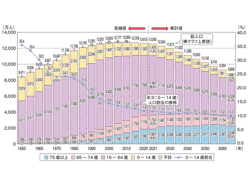 日本の人口は2021年10月1日時点で1億2,550万人となっているが、2053年には1億人を割り込んで9,924万人となる見込みだ。さらに2065年には8,808万人となる。