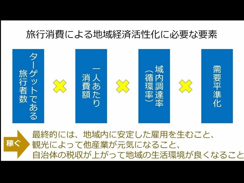 また、観光による地域振興に必要な要素についても説明。旅行者数や1人当たり消費額、需要平準化に加えて「域内調達率(循環率)」を挙げた。地域での企業間の取引を精査し、お金がどのように流れているかを追跡することを勧めた。「地域内に安定した雇用を生み、観光によって一次産業などほかの産業を元気にし、自治体の税収が上がって生活環境が良くなることが最終的な目的です」と強調した。