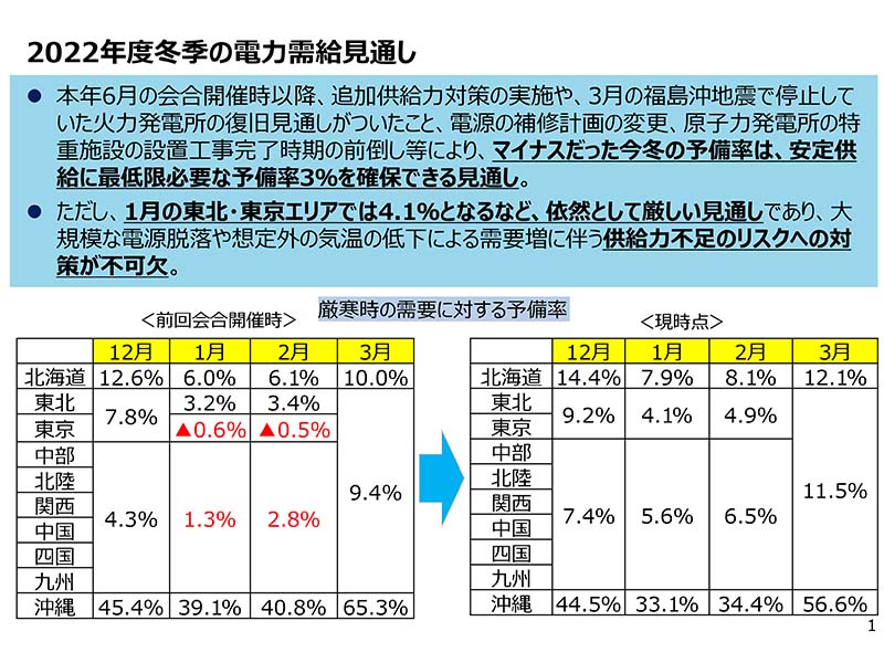 2022年11月1日に公表された試算では、2022年12月~2023年3月にかけての予備率は、国内のいずれの地域で3%を上回っている状況になる。そのため、「大規模な電源脱落」や「想定外の気温の低下による需要増」といった一定の状況を除けば、2022年度の冬季の電力は基本的に足りる見込みとなっている。