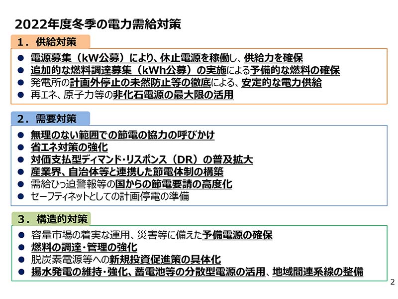 電力需給対策は、「供給対策」と「需要対策」、「構造対策」の3つが計画されている。2022年6月7日にも同様の対策が公表されている。2022年11月1日に公表された対策項目と、6月時点との違いは以下の通りである。