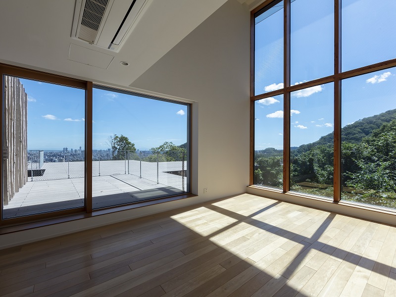 エレベーターの乗降口を降りてプライベート感の濃い廊下を歩いて室内に入ると、その巨大な窓に圧倒される。木の質感が特徴的なサッシは、北欧の厳しい冬を暖かく過ごせるよう開発された「Viking Window社」の3重ガラスの特注品。これを通して見える景色は他の住戸の存在を感じさせず、「借景」を際立たせている。