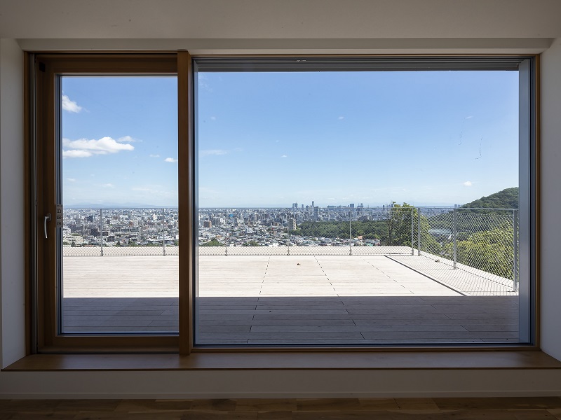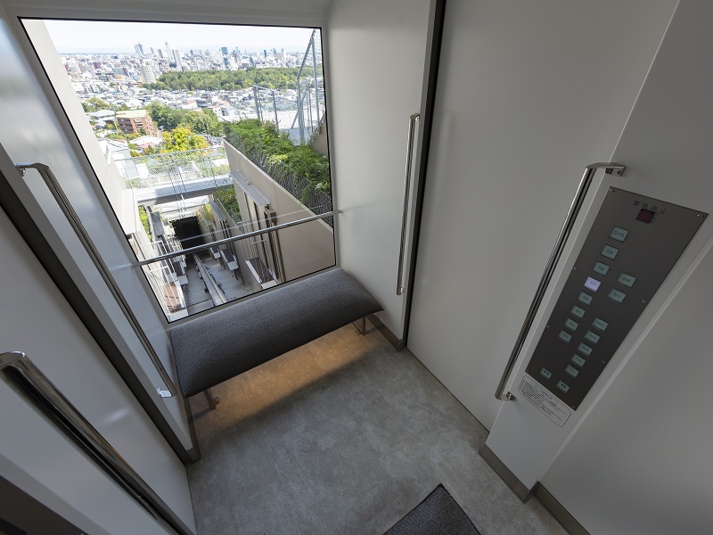 この地区からは札幌都心を一望でき、周辺の緑も目に飛び込んでくる。「プロスタイル札幌 宮の森」の自慢の1つがこの眺望だ。室内や屋外階段、各戸の玄関近くに直行できるエレベーターからは、ビル群と自然が調和した「借景」を存分に楽しめる。