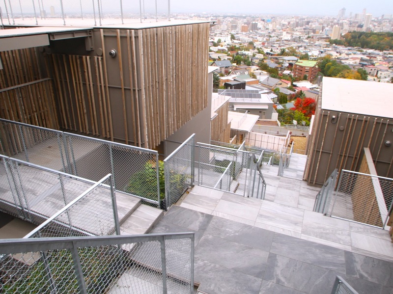 札幌は全国的にも観光や開発のポテンシャルが高く、中でも「宮の森」地区は特別な位置づけだったため、同社は宅地として売り出されていない段階で予定地を取得し2年かけて手を加えた。隈さんによる設計に3年以上、施工にも3年以上をかけた一大プロジェクトだ。設計から隈さんがチャレンジを重ねたことで、4,000m2以上の敷地に20戸のみという、贅沢な「丘のような建築」ができあがった。