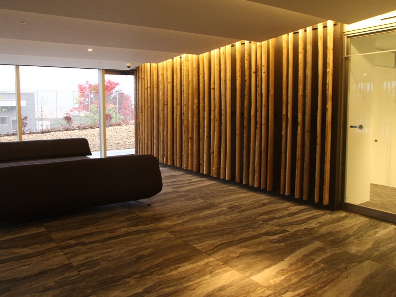 敷地外から仰ぎ見ても、屋外階段を歩いていてもこのスギは目に飛び込んでくるが、特別な存在感を放っているのがエントランスやロビーだ。間接照明で樹皮の残る質感と陰影が浮き上がり、立体感が目を見張る。遠目に見るとシャープ感と開放感があるが、近くで目を凝らすと、1本ごとに長さや厚みが微妙に違うため、工業製品のような均一性がなく、安らぎを与えてくれる。木を自然な形のまま使うこの手法は初のチャレンジといい、製材された規格品の板にはない「ふぞろいの価値」を表現できたという。