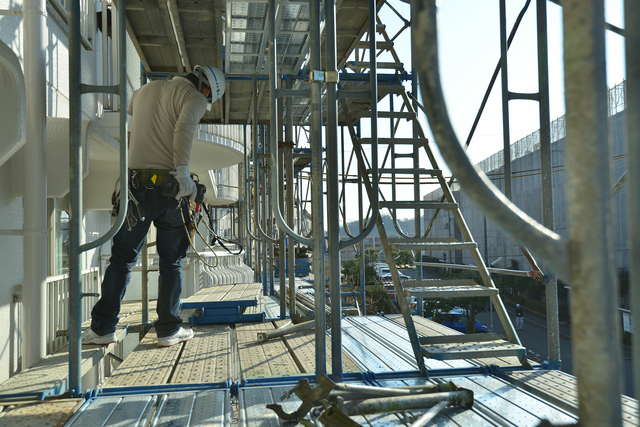 「大規模修繕で通常行われている修繕工事は、大きく4つ。外壁や鉄部の塗装、タイル補修、コーキングの打ち換え、共用廊下屋上などの防水関係の補修工事です。ポイントはこれらの工事が足場の設置を必要としていることで、足場の設置には一般的に通常工事費用全体の20~25%もの費用がかかります」(山本さん:以下同)