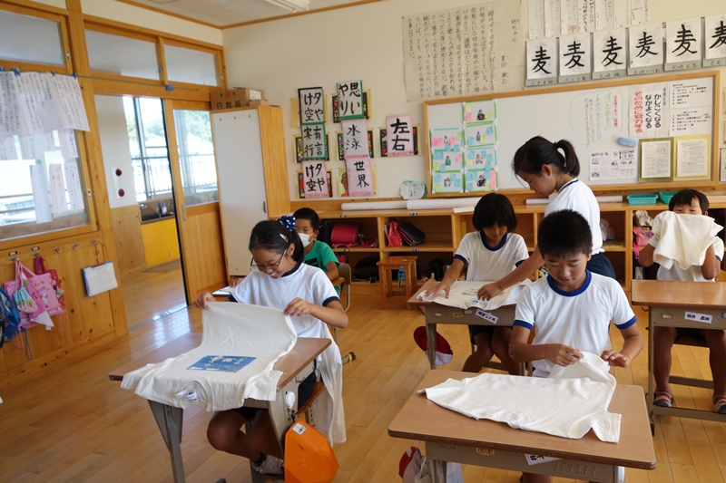 「授業は3回構成で、最初はTシャツ展の紹介をし、GWに行われる2回目ではひらひらする風景を見てTシャツを作り、それを海外に送り出します。3回目はTシャツが戻ってきたタイミングでその国の話をする。子どもたちを海外に送り出す授業はなかなか全員に経験してもらうわけにいきませんが、これなら町内8校の50~60人全員に経験してもらえ、国際理解を深められます。
