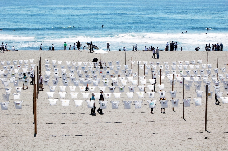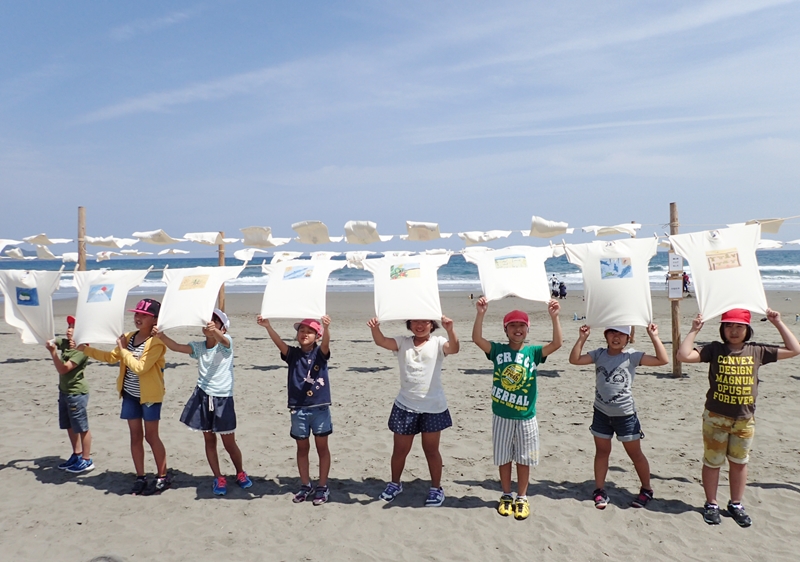 最初は役場職員、商工会、商店主などを中心に30人ほどが実行部隊となり、ボランティアで活動がスタートした。初年は北出氏の作品をプリントしたTシャツ200枚ほどが太平洋に面した全長4キロの入野の浜に翻っただけだが、2回目からは作品を公募、参加料をもらって展示し、その後にTシャツを返還するという仕組みになった。